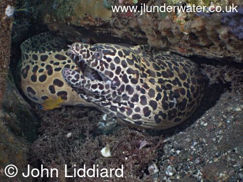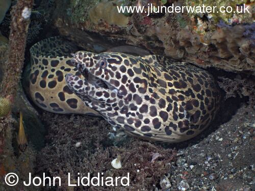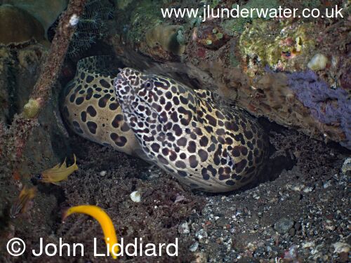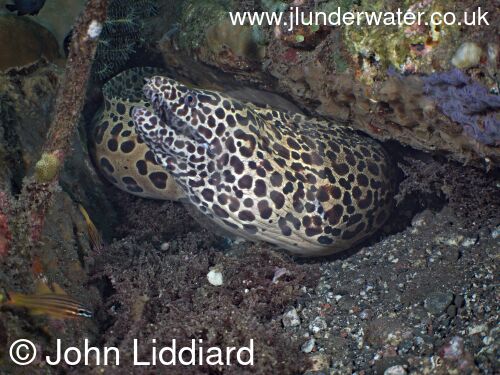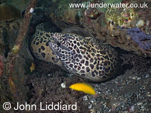 Bali, Indonesia. Alam Anda Resort. Sidem Macro Point. Honeycombe moray eel. https://www.diveworldwide.com. https://alam-anda.com/